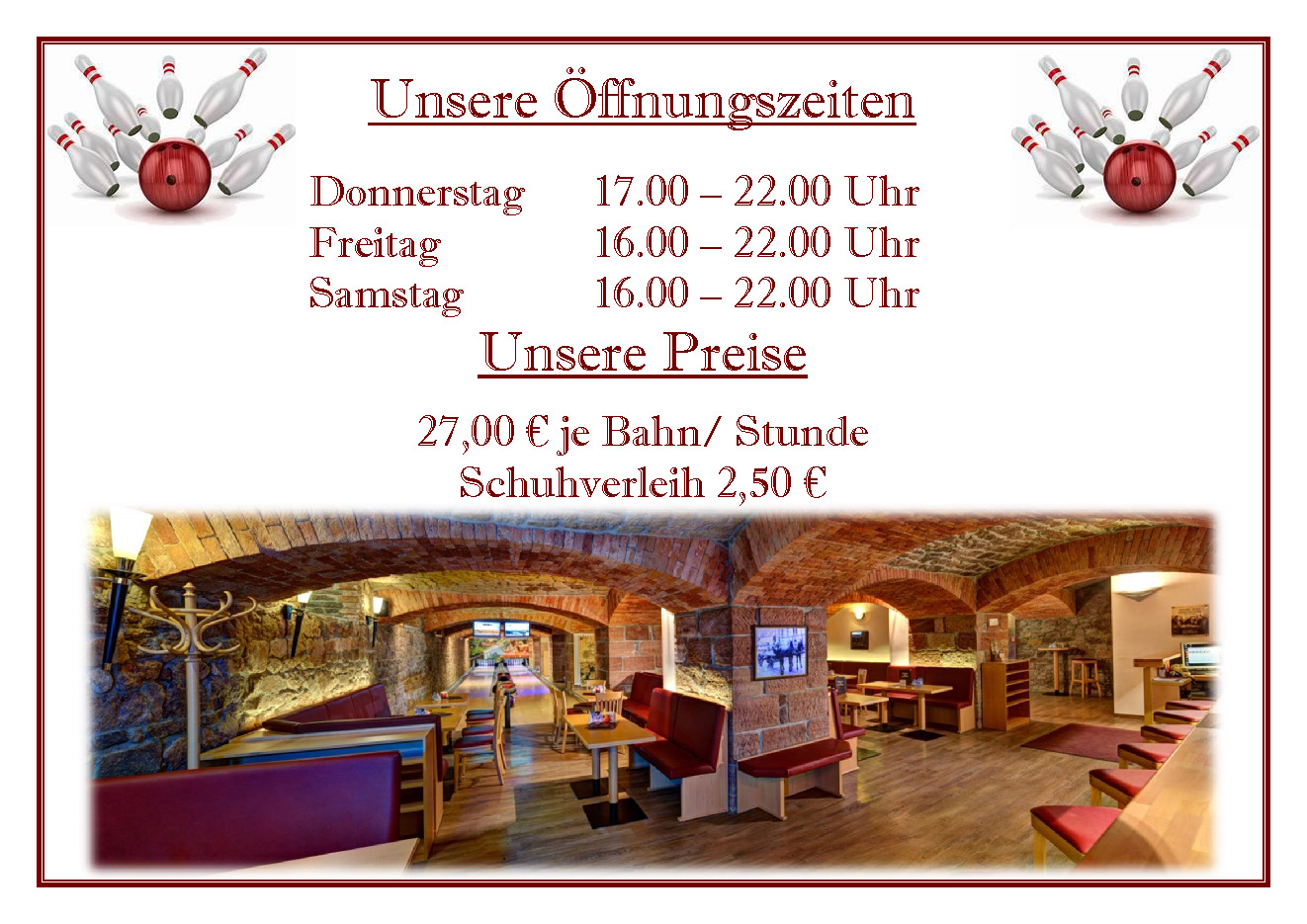 Im imposanten Natursteingewölbe des ANKERHOF - Bowlingkellers erwarten Sie 6 moderne Bowlingbahnen.